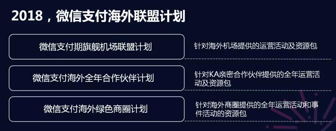 3.微信支付海外联盟计划将开启,推出旗舰机场联盟、海外全年合作伙伴、海外绿色商圈等多个计划。